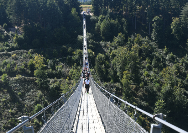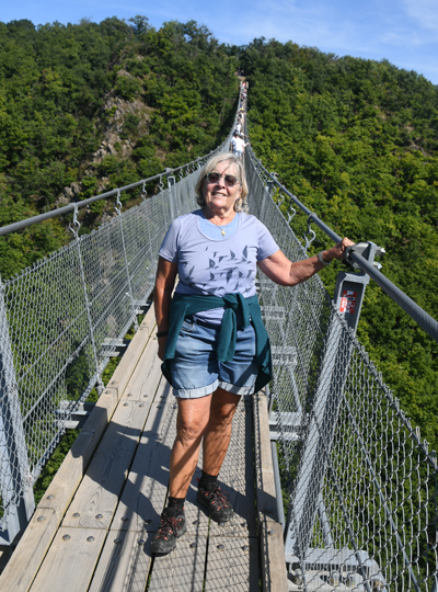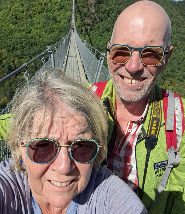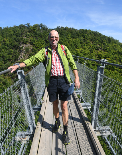 Nach einem misslungenen Versuch mit den eBikes zur Hängeseilbrücke Geierlay nahe Sosberg und Mörsdorf zu fahren, sind wir nun am Sonntag bei schönstem Wetter mit dem Wohnmobil nach Sosberg gefahren. Vom Parkplatz wandern wir ca. 2km zum Brückenende in der Gemeinde Sosberg.